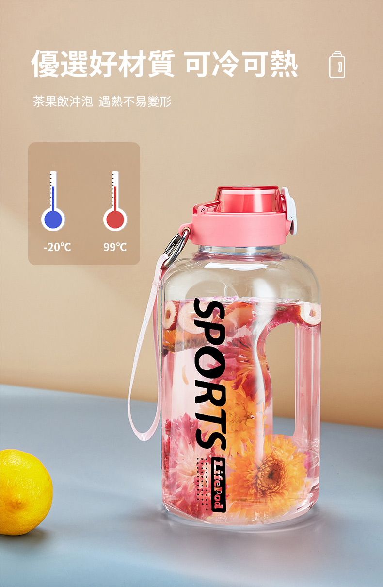 運動出行懂你所需,1.6L/2.6L大容量,運動人士首選,滿足您一天的飲水需求,進口食品級Tritan材質,安全不含BPA,可加熱水,無異味保障喝水健康,360度密封防漏,食品級矽膠密封墊與安全鎖扣,安心攜帶外出,優選好材質可冷可熱。