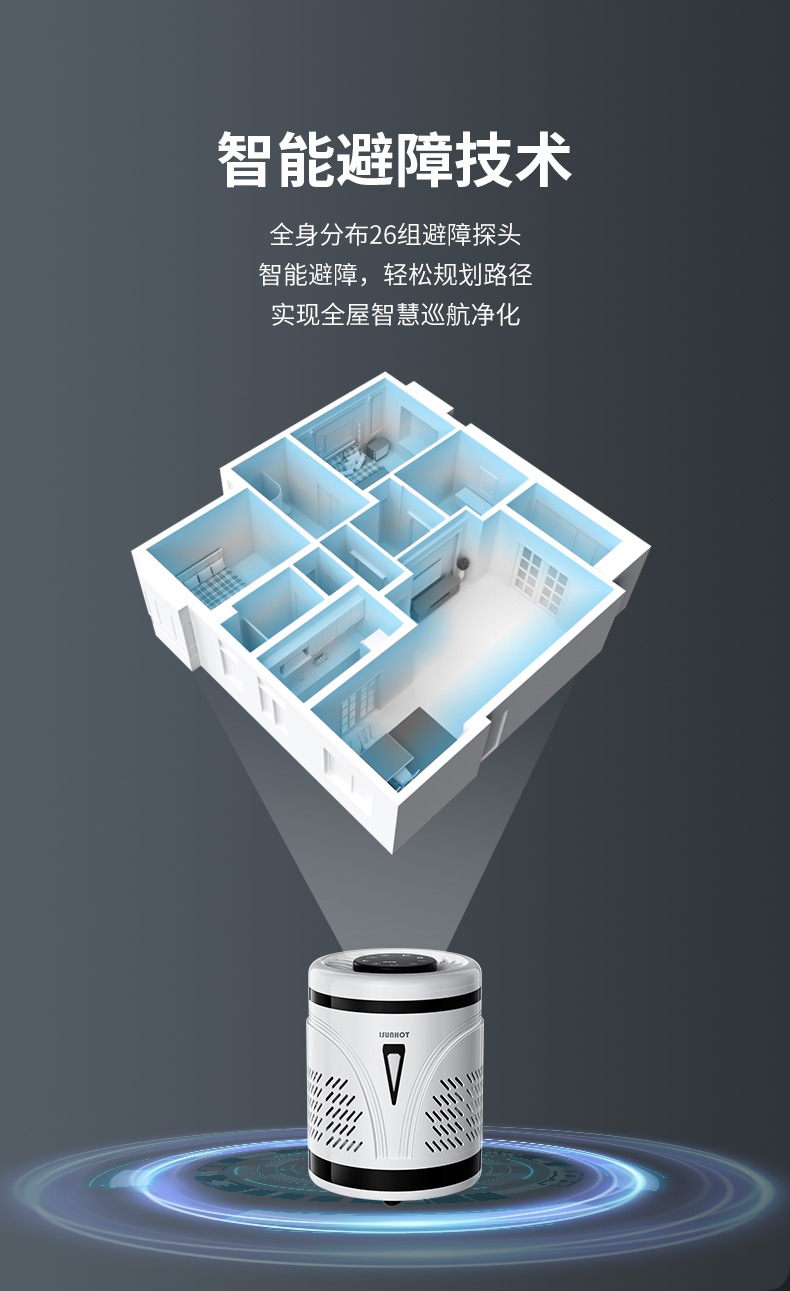 产品简介:移动空气净化器,除菌除醛出病毒高效净化,智能整屋移动,一台覆盖整屋无需搬动,净化效率一台顶传统有线空气净化器4台,全身分布26组避障探头,智能避障,轻松规划路径实现全屋智慧巡航净化,......