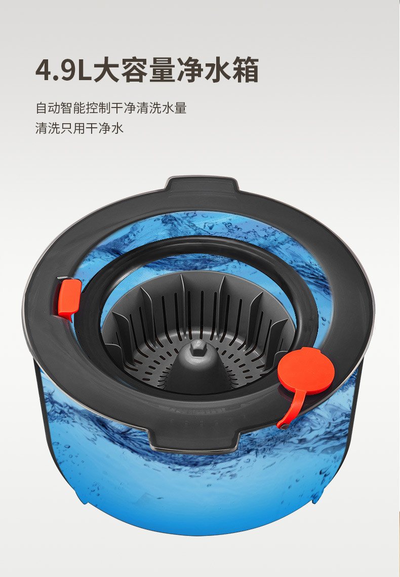 净污分离免手洗-单桶净污分离拖把,单通洗脱一体,比起传统双桶更轻巧节省空间。4.9L大容量净水箱,自动只能控制干净清洗水量,清洗只用干净水。采用厚40MM大吸力超细纤维拖头,强力吸水去污,可拆卸更换方便,多角度灵活转动,清洁低矮缝隙,轻松清理多种桌凳脚低矮缝隙等卫生死角。